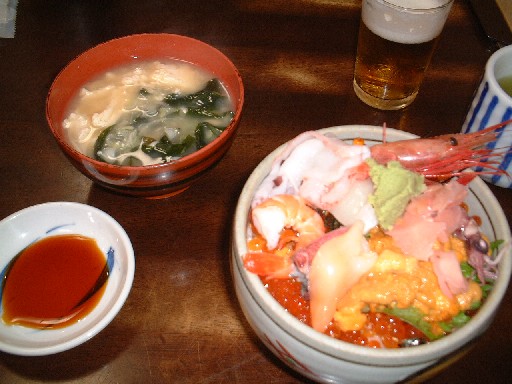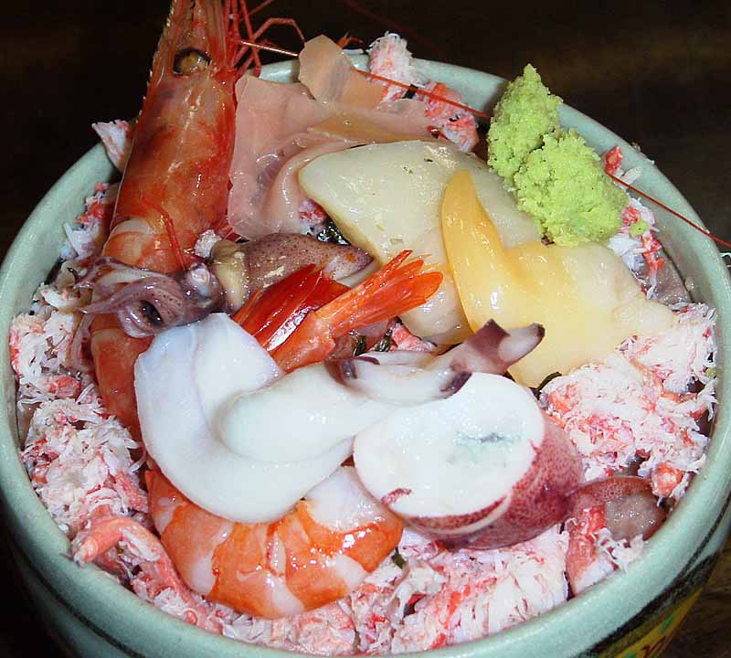ぼくが食べたのはかに肉ねぎとろ合わせ丼。ご飯の上に分厚くネギトロを敷き詰め、その上にさらにかに肉をぎっしり敷き詰め、さらにその上に海老・タコ・ホタテ・バカ貝(?)などの魚介類をどっさりのせたインパクト十分のどんぶりです。ネタに隠れてなかなかご飯が現れないのでした。