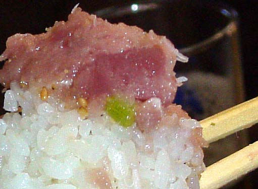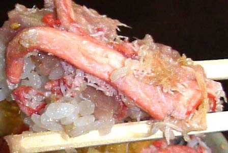 写真1 うまそうでしょう。メシ、ネギトロ、カニ、魚介の四層構造です。