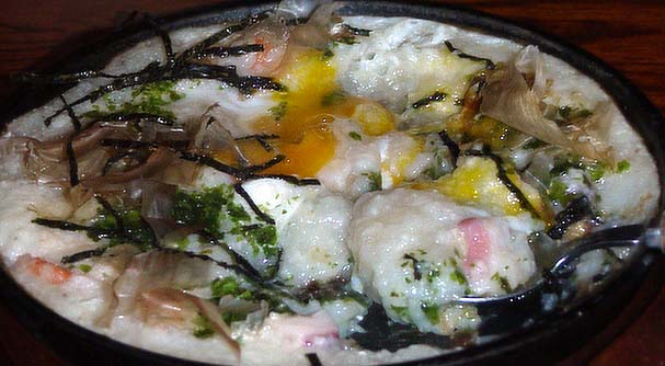 出汁や醤油で味付けしたとろろ芋のベースに、シーフードやベーコンなどいろいろな具を載せて焼いたもの。卵ものってました。熱いうちに食べます。
