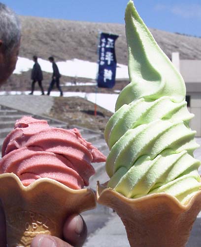 白根山火口登山口のレストハウスで食べたイチゴアイスと青リンゴアイスは、とほほ。たぶん見た目から想像できる味です。また、おとめミルクを食べたい。