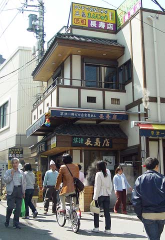 道行く人に出来立て熱々のまんじゅうを差し出してアピールする姿はもはや草津の風物詩。とくに西の河原通りにある長寿店のまんじゅうはアンコから自家製でひと味違うのだ。とってもウンマイ。