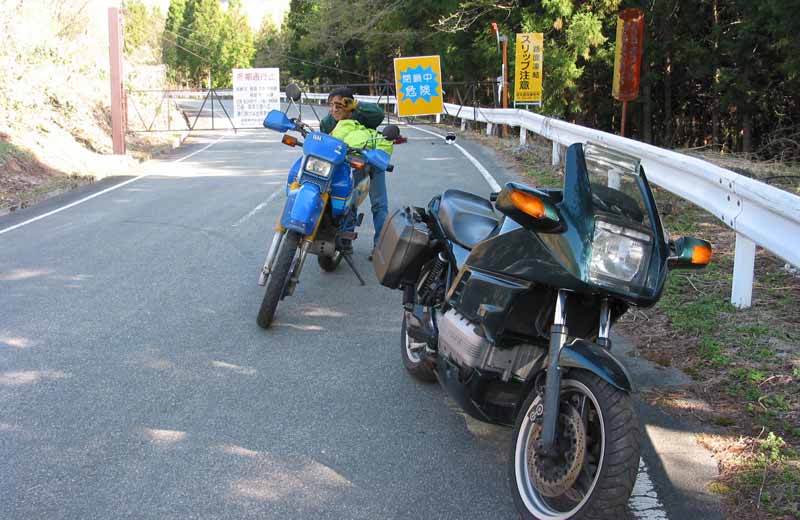 5月3日。群馬県の万座温泉から長野県高山村に抜けるお気に入りの峠道(昔は有料道路だったといいますが、いまはただの舗装された林道。最高地点は1900m超)です。じつは、万座温泉の入り口には通行止めの看板が立っていたんですが、えらくルーズなものだったし、昨年の同じ時期は問題なかったので無視してしまったのでした。