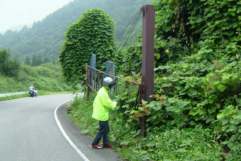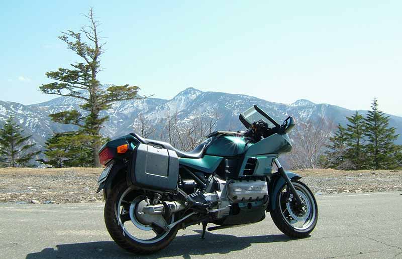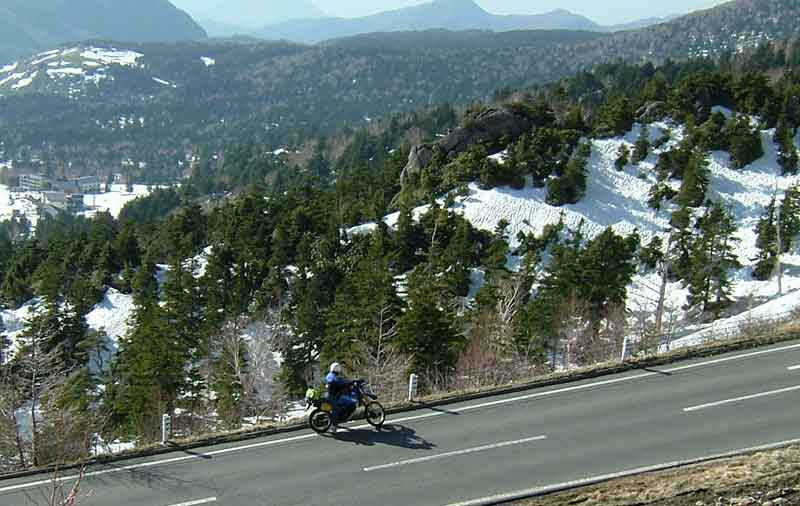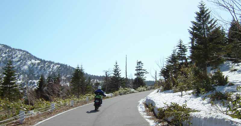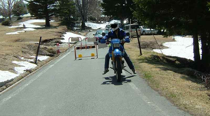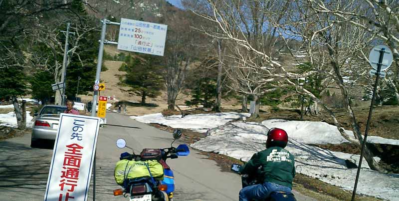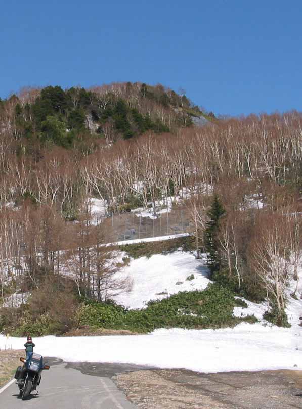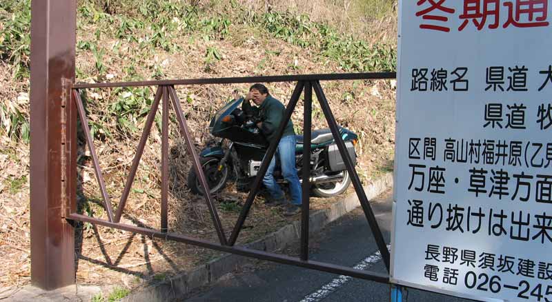 5月3日。群馬県の万座温泉から長野県高山村に抜けるお気に入りの峠道(昔は有料道路だったといいますが、いまはただの舗装された林道。最高地点は1900m超)です。じつは、万座温泉の入り口には通行止めの看板が立っていたんですが、えらくルーズなものだったし、昨年の同じ時期は問題なかったので無視してしまったのでした。