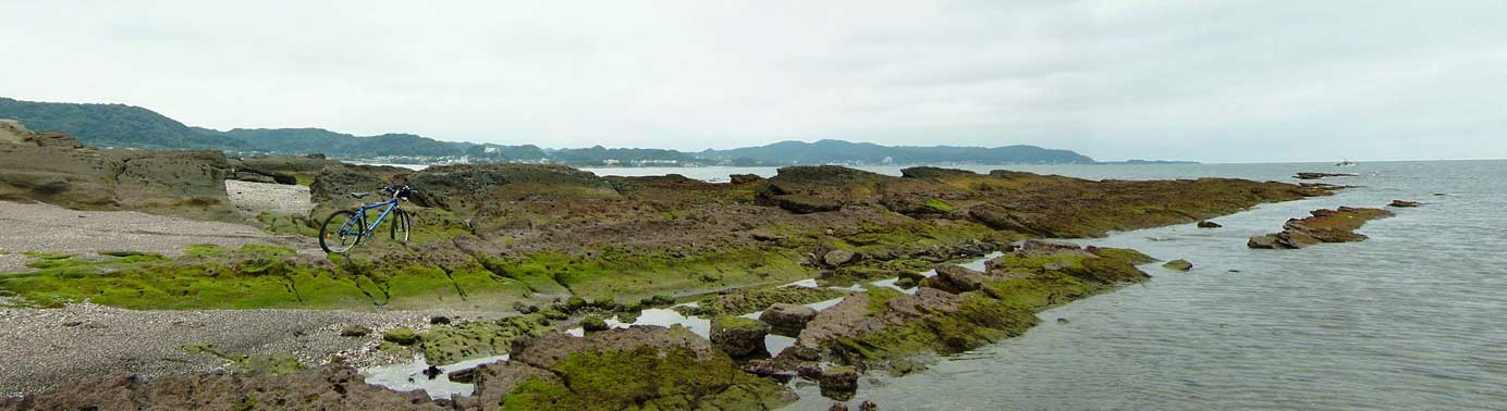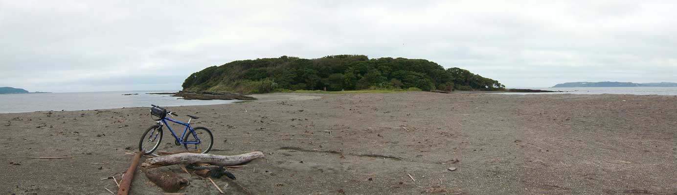 関東大震災の隆起で今の形になった島だそうです。無人島には違いないけど、細長い砂州でつながっていて、自転車でも渡れます。今の時期は釣り人以外に立ち入る人もなく、さみしいを通り越して不気味な島でした。